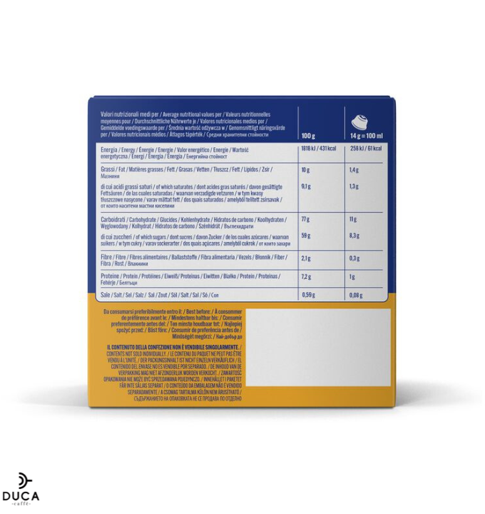 Zucchero, latte scremato in polvere 14,9%, sciroppo di glucosio, grassi di cocco non idrogenati, caffè istantaneo 3,5%, cacao magro in polvere, fecola di patate, addensante: E412, stabilizzante: E340ii, emulsionante: E471, sale, aromi.