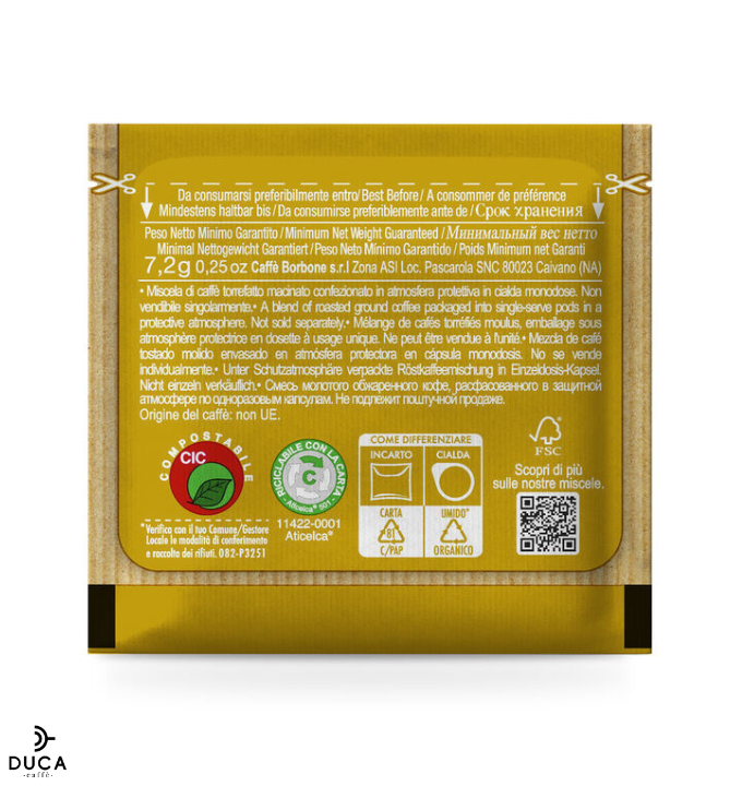 Cialde Caffè Borbone miscela Oro, dolce e raffinata: sintesi perfetta tra gusto, cremosità, dolcezza e carattere. La miscela Oro, appaga anche i palati più esigenti.