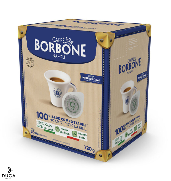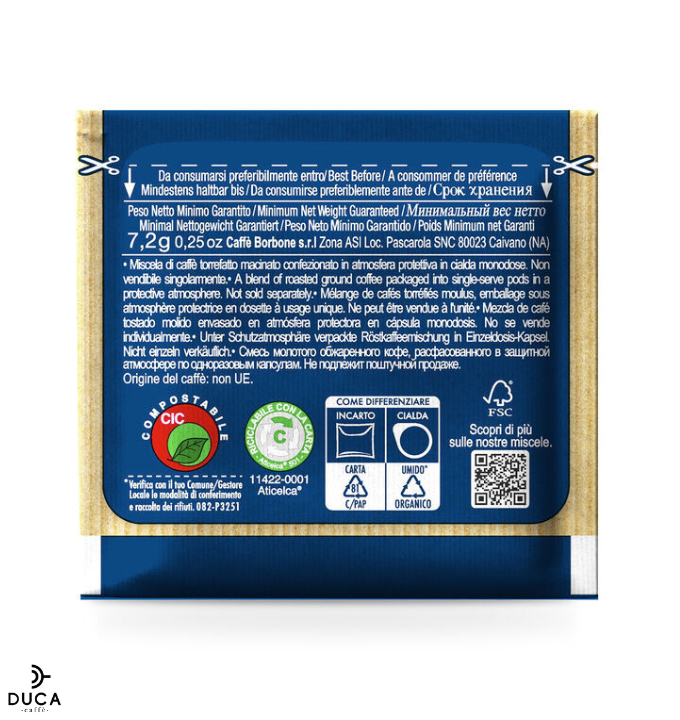 Cialde Caffè Borbone miscela Blu. Equilibrato e corposo, si caratterizza per il suo sapore nobile, il carattere vigoroso e l’aroma intenso.
