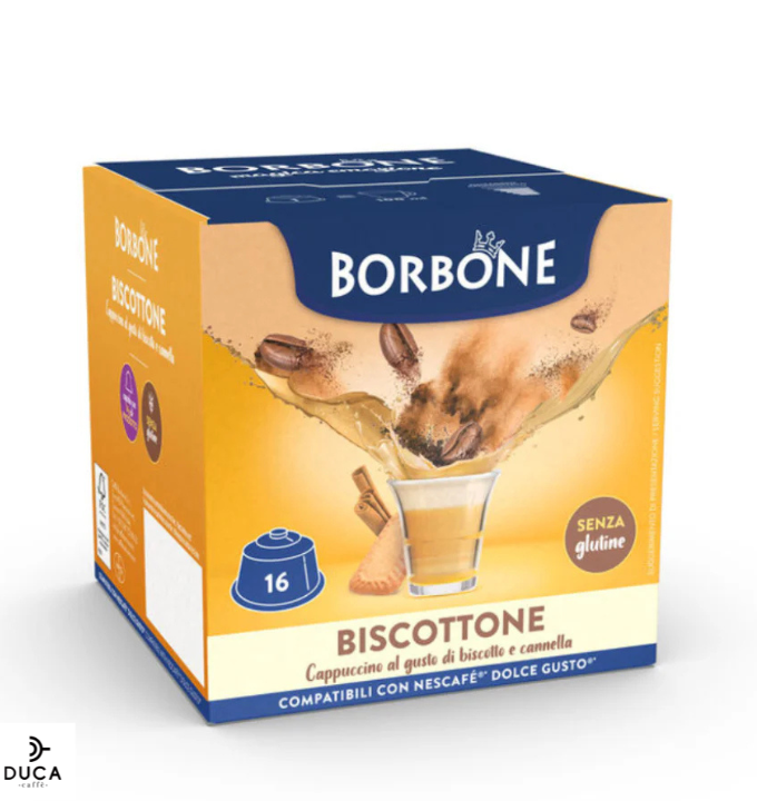Capsule compatibili con macchine a marchio Nescafè®* Dolce Gusto®*. Per la tua colazione o per una pausa golosa, prova le nuove capsule Borbone Biscottone: tutto il piacere di un ottimo cappuccino, con un tocco di gusto al biscotto.