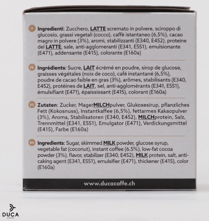 Zucchero, LATTE scremato in polvere, sciroppo di glucosio, grassi vegetali interamente idrogenati (noce di cocco), caffè istantaneo (6,5%), cacao magro in polvere (3%), aromi, proteine del LATTE, stabilizzanti (E340, E452), lattosio (LATTE), sale, anti-agglomeranti (E341, E551), emulsionanti (E471, E472e), addensante (E415).